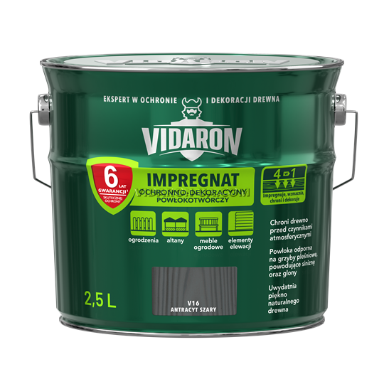 VIDARON IMPREGNAT серый антрацит матовый V16 2,5 кг – высококачественное глубокопроникающее защитно-декоративное средство для древесины, надёжно защищающее деревянные конструкции от биологических разрушителей, атмосферных воздействий и ультрафиолетового излучения. Благодаря уникальной формуле, импрегнат проникает глубоко в структуру древесины, обеспечивая долговременную защиту и подчёркивая естественную красоту дерева.