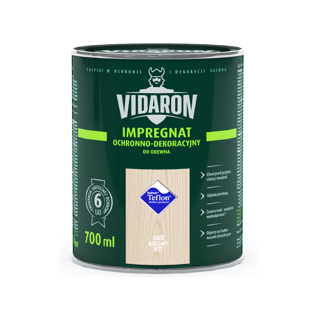VIDARON IMPREGNAT выбеленный дуб V17 700мл – это надежное средство для защиты древесины от влаги, ультрафиолета, вредителей и атмосферных воздействий.
