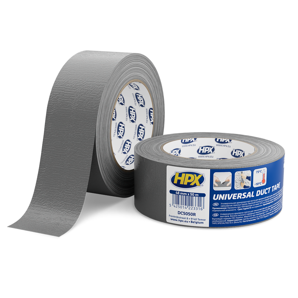 Лента армированная односторонняя Universal HPX Duct Tape 1900 черного цвета размером 48мм х 50м — это надежный универсальный помощник, соответствующий высоким стандартам качества. Армированная лента HPX идеально подходит для широкого спектра задач, обеспечивая быстрое и эффективное решение. Она обладает высокой липкостью и средней прочностью, что позволяет использовать ее для временной фиксации деталей, ремонта повреждений, а также для упаковки и связывания тяжелых грузов, таких как металл, дерево или бытовая техника.