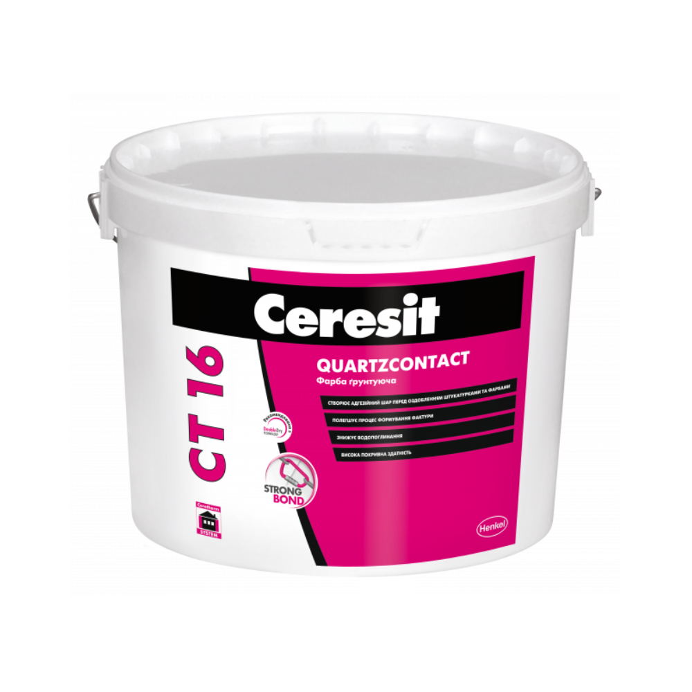 Ceresit CT 16 (10л) – це високоякісна адгезійна ґрунтуюча фарба, розроблена для підготовки основи перед нанесенням декоративних штукатурок та фарб, особливо акрилових, силіконових та силікатних. Вона є незамінним елементом при влаштуванні систем утеплення фасадів, а також при внутрішніх роботах. Цей продукт забезпечує ідеальне зчеплення наступних шарів покриття з основою, значно покращуючи якість та довговічність оздоблення.