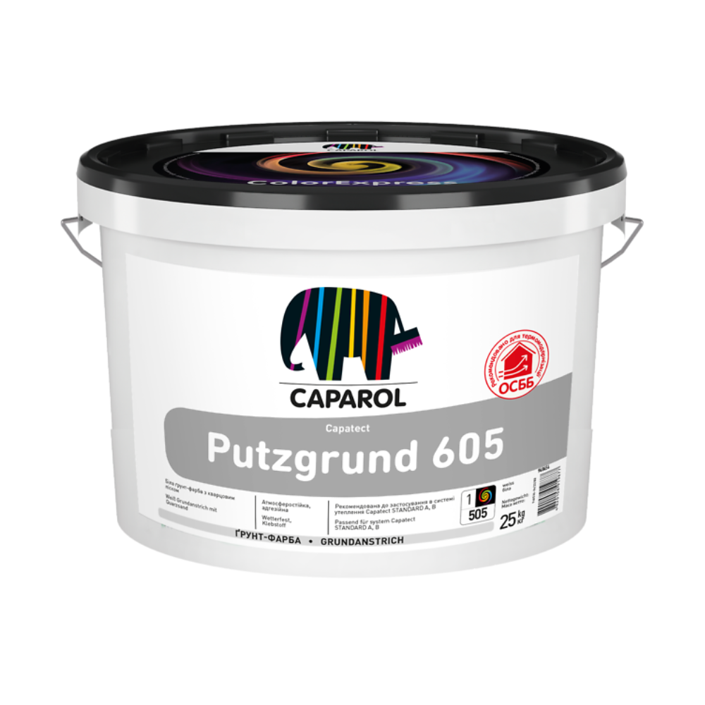 Ґрунт-фарба Caparol "Capatect Putzgrund 605" – це високоякісна акрилова ґрунт-фарба для зовнішніх та внутрішніх робіт, що є ідеальним рішенням для підготовки мінеральних поверхонь перед нанесенням декоративних штукатурок. Завдяки своєму унікальному складу, вона створює шорстку, матову поверхню, яка забезпечує відмінну адгезію для подальших покриттів. Білий колір ґрунтовки допомагає вирівняти тон основи та підсилити яскравість фінішного шару. Ґрунт-фарба ефективно регулює поглинаючу здатність поверхні, що сприяє рівномірному висиханню та затвердінню штукатурки.