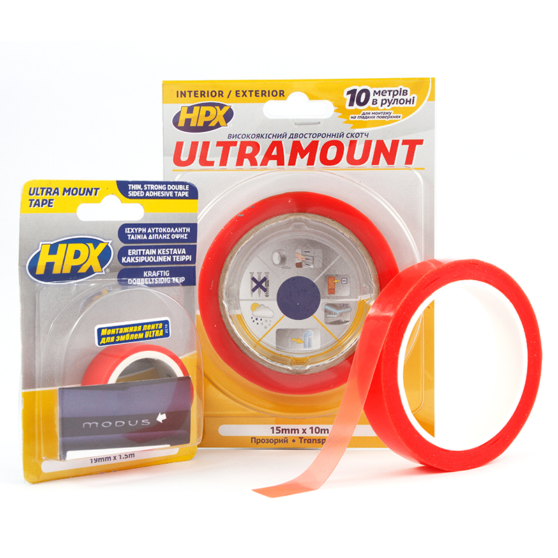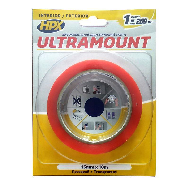 Лента двухсторонняя ULTRA MOUNT 15мм х 10м прозрачная (блистер) (модель UM1510) — это сверхтонкий промышленный скотч от известного бельгийского производителя HPX, разработанный для чрезвычайно прочного и незаметного соединения различных материалов. Эта лента состоит из прозрачной полиэстеровой основытолщиной всего 0,25 мм и шириной 15 мм, что делает ее практически невидимой после нанесения. С обеих сторон лента покрыта высококачественным клеевым слоем, обеспечивающим прочность на отрыв до 4 кг на 25 мм, гарантируя надежное соединение.