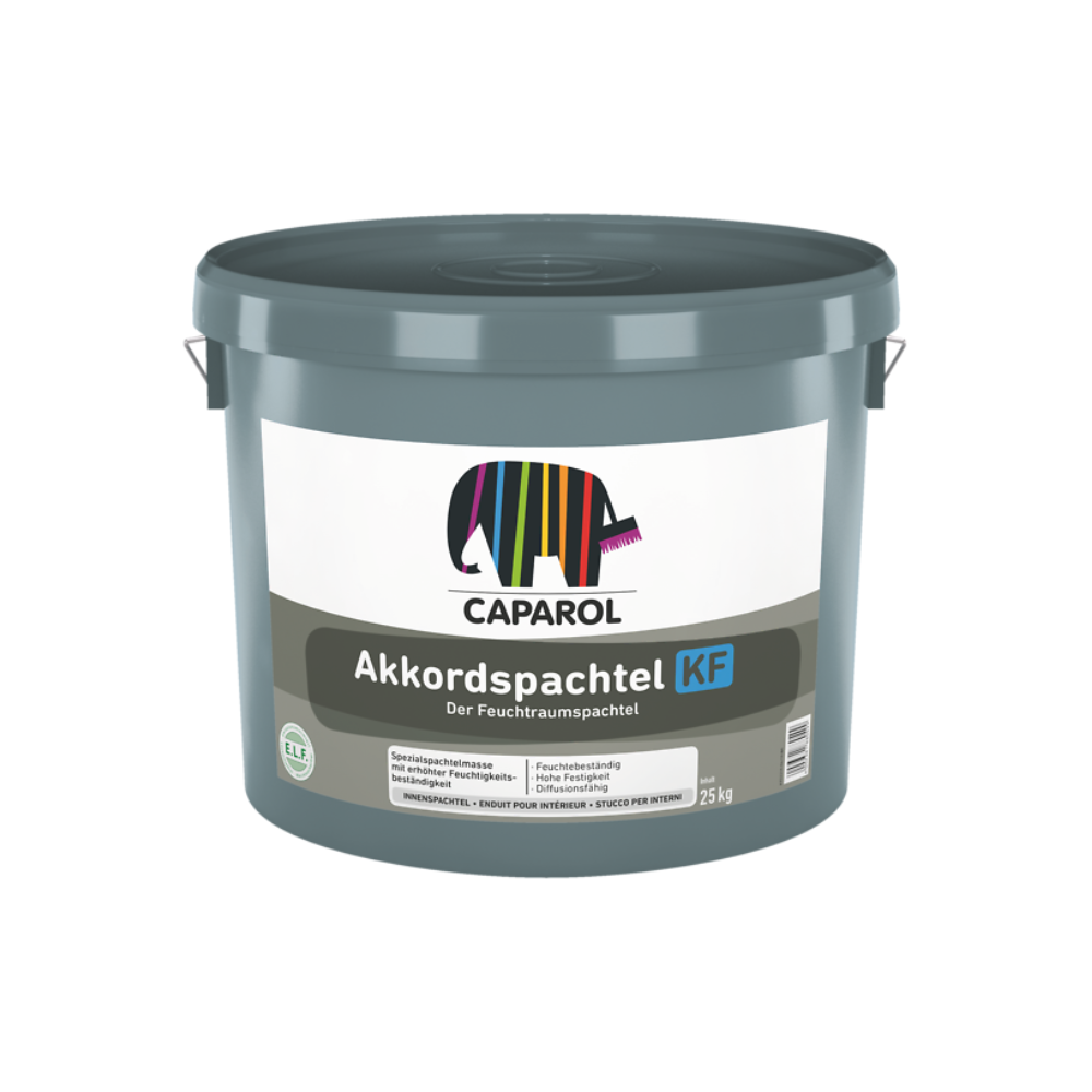 Caparol "Akkordspachtel KF E.L.F." поставляється у пластикових відрах по 25 кг, має натурально білий колір, що може бути тонований до 5% повнотоновими та тонуючими пастами CaparolColor або AmphiColor. Матова ступінь глянцю створює елегантний фініш. Зберігати продукт слід у прохолодному місці від +5°С до +35°С, гарантійний термін зберігання – 24 місяці.