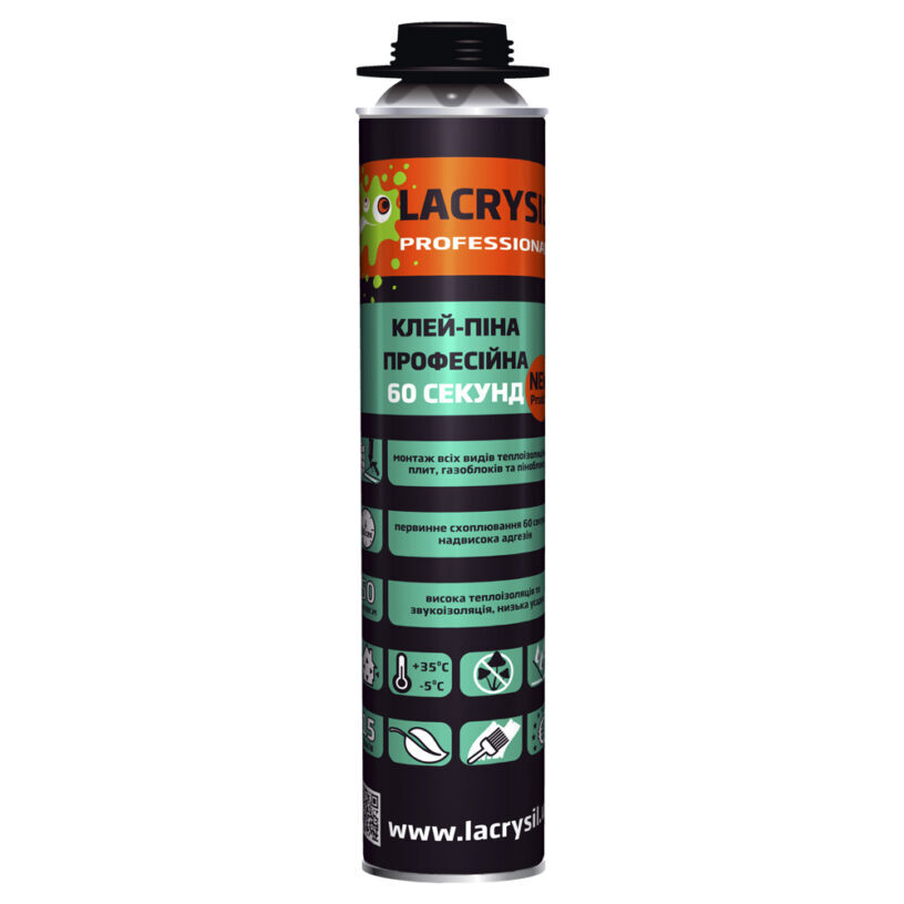 Професійна клей-піна LACRYSIL PRO 60 секунд є всесезонним продуктом, що дозволяє її використання в широкому діапазоні температур – від -10°C до +30°C, що робить її незамінною як влітку, так і взимку. Низьке вторинне розширення піни запобігає деформації теплоізоляційних матеріалів, а високі теплоізоляційні властивості сприяють зменшенню тепловтрат. Цей продукт є екологічно безпечним, не містить фреонів та озоноруйнуючих речовин.