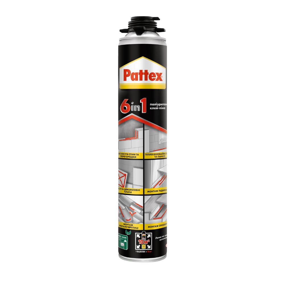 Pattex 6 в 1 піна-клей 750 мл (Pro) — це професійне рішення для тих, хто цінує швидкість, надійність та багатофункціональність у будівельних матеріалах.