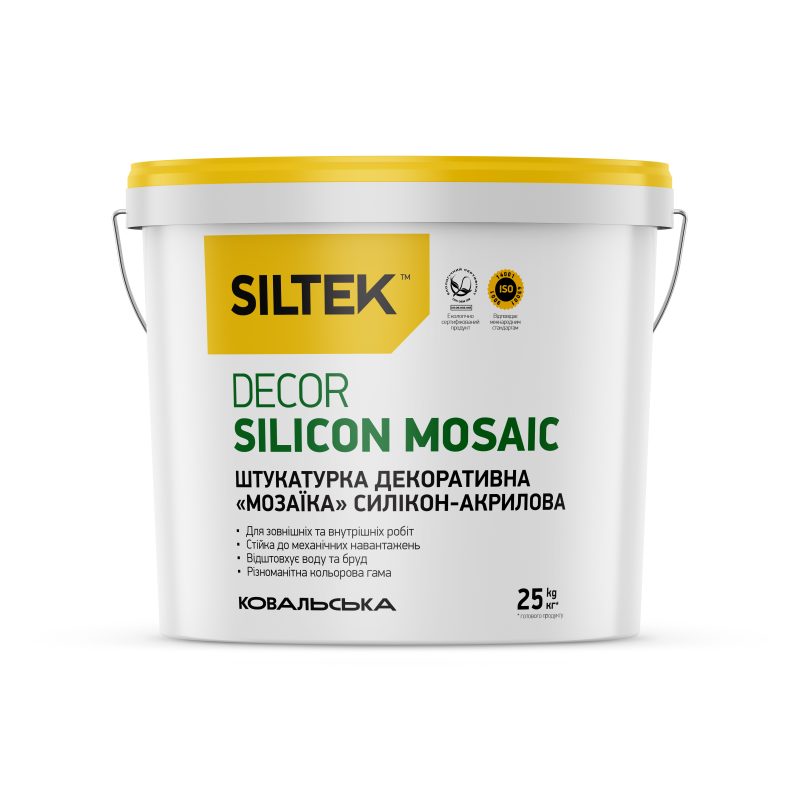 Легкість у нанесенні та довговічність експлуатації роблять Siltek Decor Silicon Mosaic ідеальним вибором для тих, хто цінує якість, естетику та практичність. Продукт поставляється у зручній упаковці – відрі 25 кг.