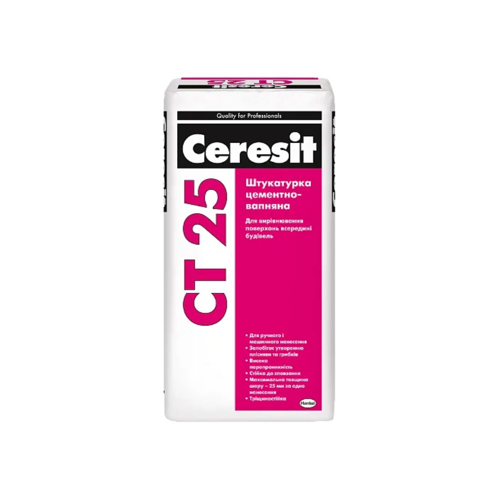 Ceresit СТ 25 – це високоякісна мінеральна штукатурка, спеціально розроблена для вирівнювання поверхонь, виготовлених з пористих бетонних блоків, газобетону та пінобетону. Завдяки своїй унікальній формулі, штукатурка має високу адгезію до пористих основ, забезпечуючи міцне та довговічне покриття. Ceresit СТ 25 відмінно підходить для внутрішніх та зовнішніх робіт, створюючи ідеально рівну поверхню, готову до подальшого оздоблення (фарбування, наклеювання шпалер, декоративних штукатурок тощо).