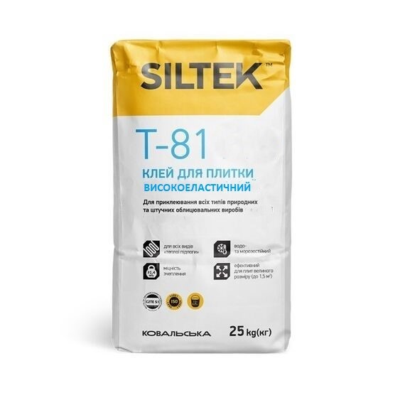Цей клей відзначається підвищеною адгезією до основи, що гарантує надійне та довговічне кріплення плитки навіть у вологих та температурно нестабільних умовах. Його пластична консистенція робить процес нанесення легким та зручним, запобігаючи сповзанню плитки під час укладання. Siltek Т-81 є екологічно чистим та безпечним у використанні.