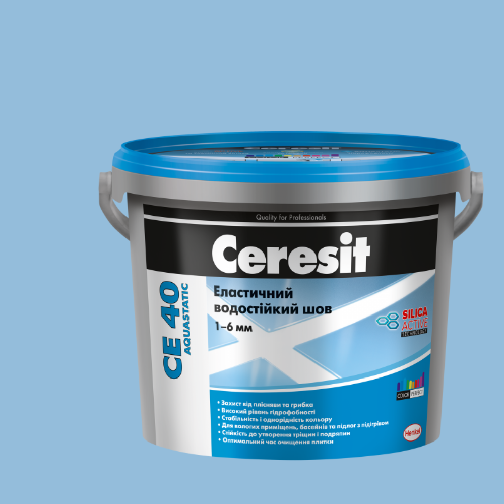 Еластичність затирки Ceresit CE 40 Aquastatic забезпечує стійкість до деформацій основи та запобігає розтріскуванню швів навіть при температурних коливаннях. Затирка також має високу стійкість до забруднень та утворення грибка і плісняви завдяки технології MicroProtect. Її легко наносити та очищати, а швидке тверднення скорочує час виконання робіт. Стійкість кольору до ультрафіолетового випромінювання гарантує збереження яскравого блакитного відтінку протягом тривалого часу.