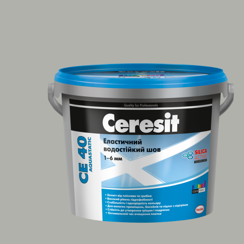 Ceresit CE 40 Aquastatic (2кг) – Еластичний водостійкий кольоровий шов до 6мм, сріблястий 04 – це високоякісна цементна затирка для швів, розроблена для облицювання керамічною плиткою, керамогранітом, скляною мозаїкою, натуральним і штучним каменем. Завдяки технології Color PROOF, Ceresit CE 40 гарантує стійкість кольору, запобігаючи вицвітанню та появі висолів, що забезпечує естетичний вигляд швів на довгі роки.