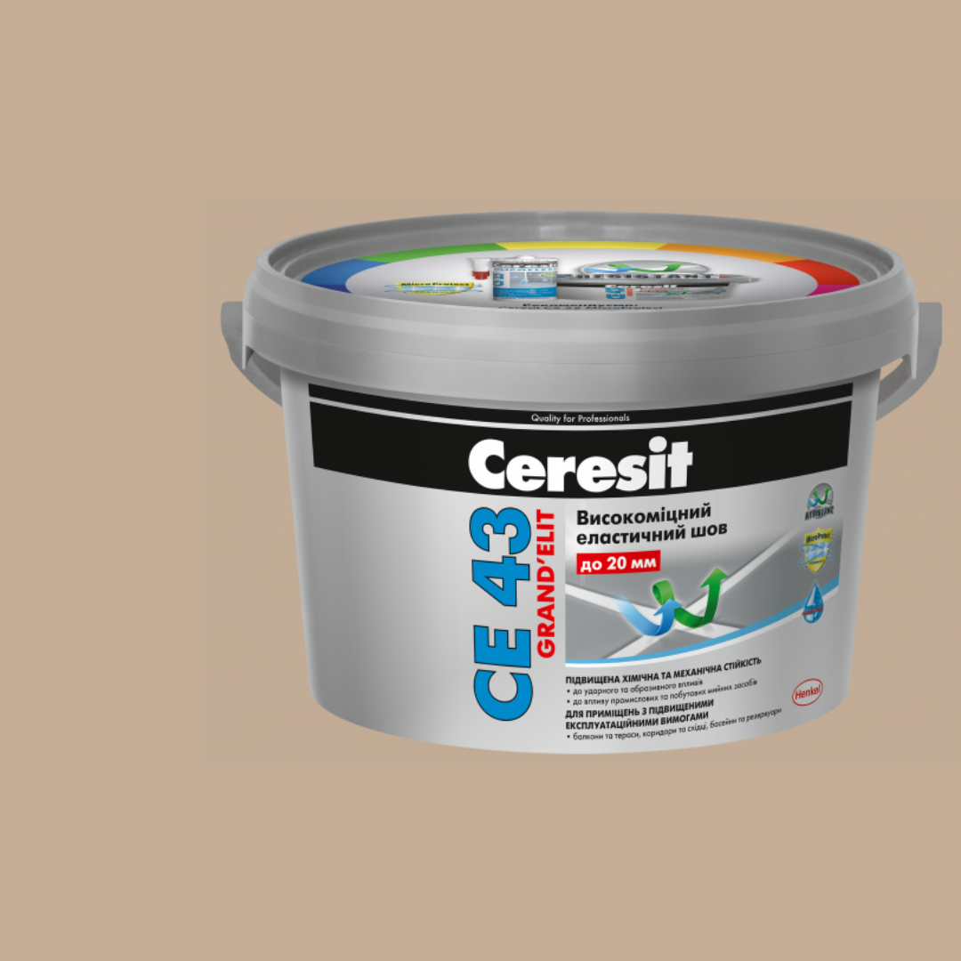 Суха суміш Ceresit CE 43 Grand'Elit призначена для заповнення швів шириною до 20 мм керамічних, скляних облицювальних плиток, а також облицювальних плиток зі штучного і натурального каменю (крім мармуру та інших світлих порід) при облицюванні вертикальних і горизонтальних поверхонь. Завдяки високому ступеню гідрофобності (aquastatic) Ceresit CE 43 краплі води не проникають в її структуру. Ця властивість дозволяє рекомендувати Ceresit CE 43 Grand'Elit для заповнення швів, що зазнають тривалого впливу води (ванні кімнати, душові на виробництві, лікувальні установи, ділянки навколо басейну, резервуари з водою). Завдяки підвищеній механічній та хімічній стійкостям (resistant) ефективна при облицюванні поверхонь, що піддаються деформаціям та інтенсивним механічним навантаженням, у тому числі й ударам, дряпанню, абразивному впливу піску та солі (підлоги з підігрівом, тераси, балкони, коридори, східці, промислові та побутові кухні, гаражні, виробничі та складські приміщення, автомийки, басейни тощо). Підвищена мікробіологічна стійкість (MicroProtect) запобігає появі цвілі, плісняви та грибка, й забезпечує довготривалу стабільність кольору.