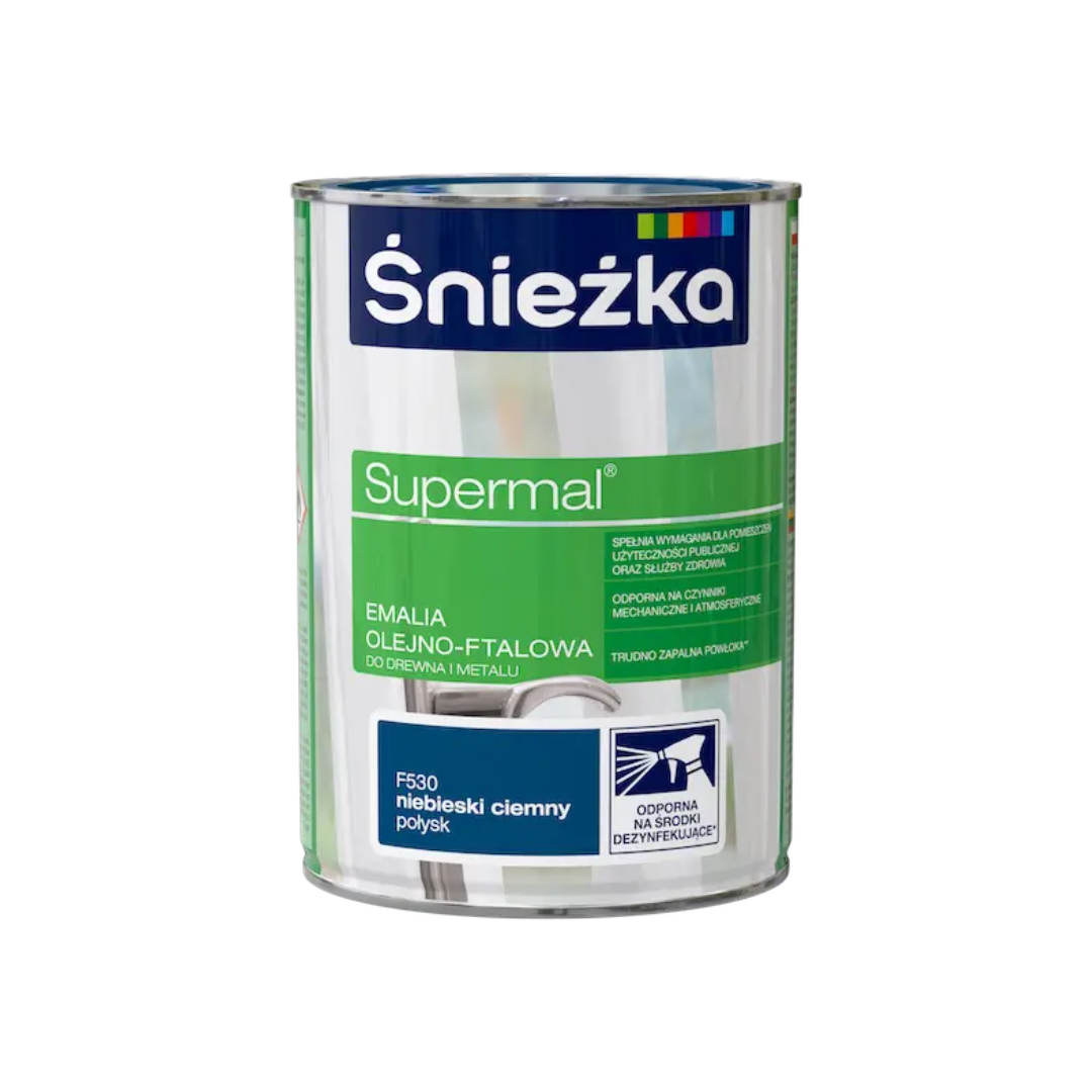 Эмаль Sniezka Supermal Ol-Ftal. F530 темно-синий, глянцевый, 800 мл – это высококачественная масляно-фталевая эмаль, которая обеспечивает прочное декоративно-защитное покрытие с элегантным глянцевым финишем. Насыщенный темно-синий цвет (F530) придаст глубины и изысканности окрашенным элементам.
