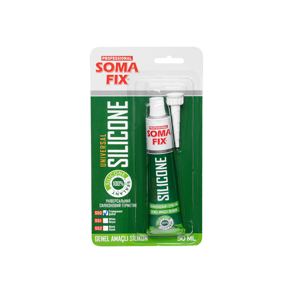 S50 Силикон SOMA FIX универсальный прозрачный, 50 мл – это компактный, но чрезвычайно эффективный однокомпонентный силиконовый герметик, представленный в удобном формате тюбика объемом 50 мл. Благодаря своей ацетоксильной основе, он обеспечивает прочное и долговечное уплотнение для широкого спектра работ. Этот универсальный силиконовый герметик Soma Fix идеально подходит для небольших ремонтных работ и точечной герметизации как внутри, так и снаружи помещений. Он широко применяется для герметизации оконных рам, дверей, сантехнических систем, а также для уплотнения мелких трещин и стыков в строительных конструкциях. Его низкая усадка и отличная устойчивость к внешним условиям (температура, вода, УФ-излучение) гарантирует максимальную надежность и долговечность выполненных работ даже в небольших объемах. S50 Силикон SOMA FIX демонстрирует превосходную адгезию к непористым материалам, таким как металл, стекло, эмаль, керамическая плитка, обеспечивая при этом надежную гидроизоляцию.