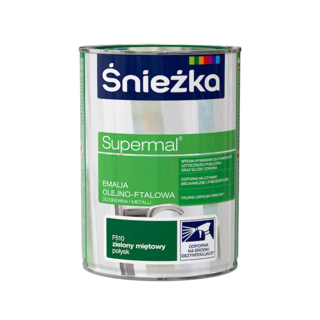 Емаль Sniezka Supermal Ol-Ftal. F510 зелена м'ята, глянцева, 800 мл – це високоякісна олійно-фталева фарба, що забезпечує надійний захист та яскравий декоративний вигляд різноманітних поверхонь. Глянцевий фініш та свіжий колір зелена м'ята (F510) ідеально підходять для оновлення меблів, дверей, вікон, а також металевих та штукатурених елементів як всередині, так і назовні приміщень.