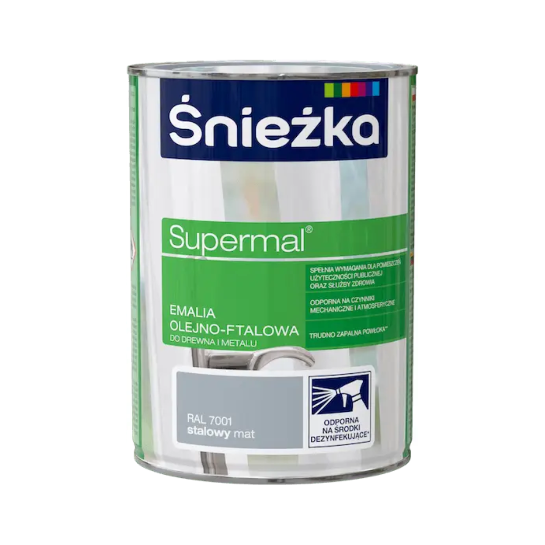 Емаль Sniezka Supermal Ol-Ftal. RAL 7001 сталевий, матовий, 800 мл – це високоякісне декоративно-захисне покриття на олійно-фталевій основі, що ідеально підходить для фарбування різноманітних поверхонь всередині та назовні приміщень. Завдяки своєму сталевому матовому кольору (RAL 7001), вона додає елегантного та сучасного вигляду.