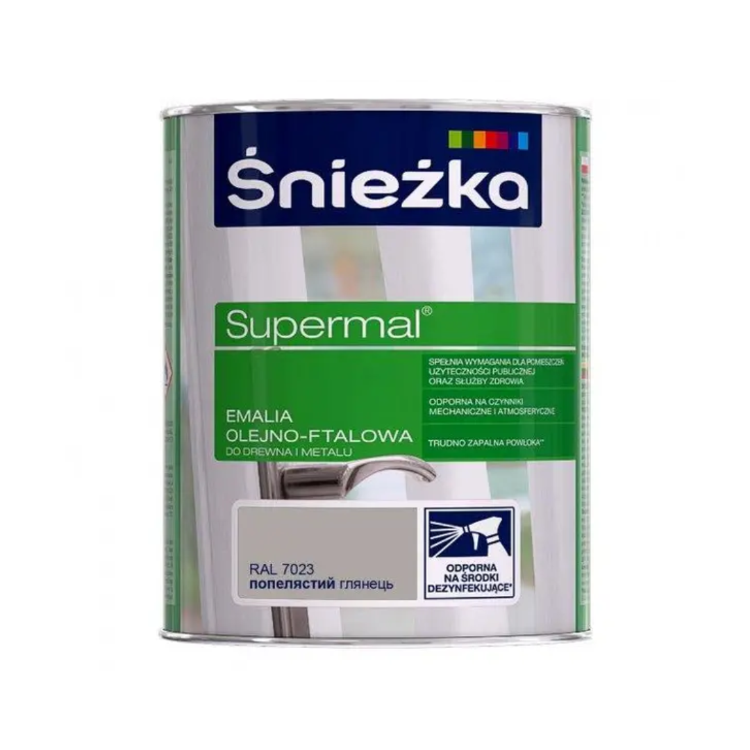 Емаль Sniezka Supermal Ol-Ftal. RAL 7023 попелястий, глянцевий, 800 мл – це високоякісне олійно-фталеве покриття, розроблене для декоративно-захисного фарбування різноманітних поверхонь, як всередині, так і ззовні приміщень. Елегантний попелястий колір (RAL 7023) у поєднанні з глянцевим блиском додасть об'єктам вишуканості та довговічності.