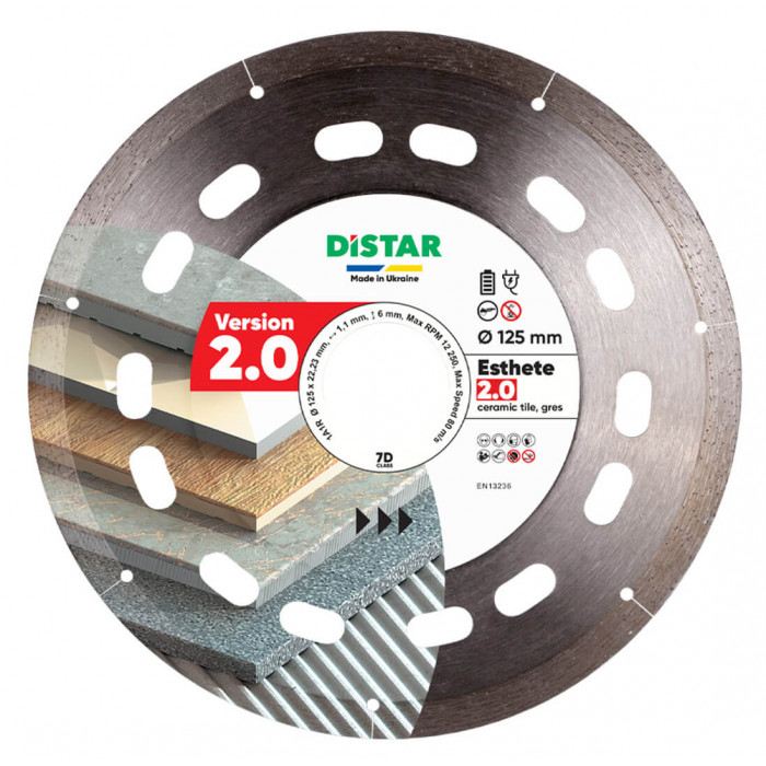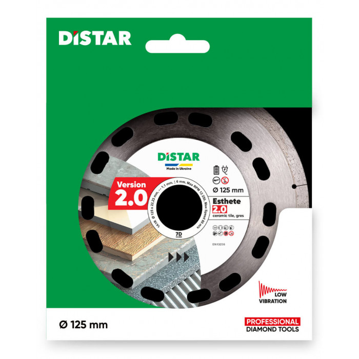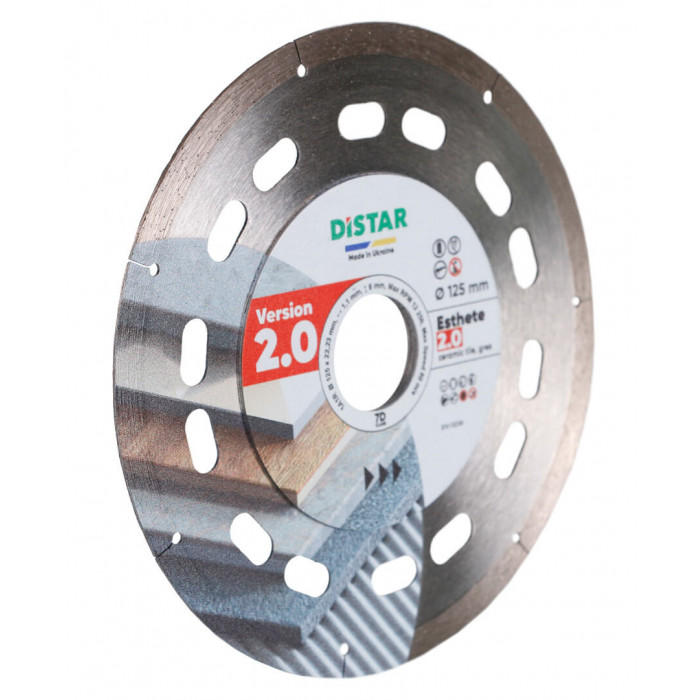 Круг алмазный отрезной 1A1R 125x1,1/0,9x6x22,23 Esthete 2.0 – профессиональный инструмент для точной и быстрой резки керамики и керамогранита. Диск оснащен 7 сегментами высотой 6 мм с алмазным напылением, что обеспечивает долгий срок службы и ровный рез без сколов. Круг подходит для угловых шлифовальных машин со стандартным шпинделем 22,23 мм, как сетевых, так и аккумуляторных. Толщина диска 1,1 мм, максимальная скорость вращения — 12250 об/мин. Во время работы алмазные сегменты самозатачиваются, обеспечивая стабильное качество реза. Доставка по всей Украине.