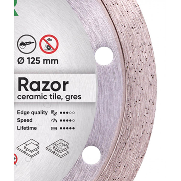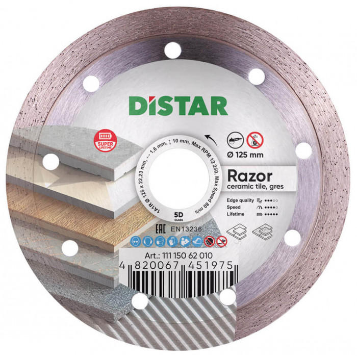 Круг алмазный отрезной 1A1R 125x1,6x10x22,23 Razor от украинского бренда Distar – профессиональный инструмент для резки сверхтвёрдых материалов. Диск идеально подходит для работы с мрамором, керамогранитом и керамикой без необходимости водяного охлаждения. Благодаря алмазному слою толщиной 1,6 мм и высоте сегмента 10 мм диск обеспечивает чистый и точный рез без сколов и трещин. Вдоль периметра диска расположены вентиляционные отверстия для эффективного воздушного охлаждения. Скорость реза до 1,5 пог.м/мин обеспечивает высокую производительность даже при интенсивной работе. Крепится на стандартный шпиндель 22,23 мм болгарки диаметром 125 мм, способной развивать скорость до 12 250 об/мин. Для чистого реза под углом 45° можно использовать насадку Slider Mechanic 45.