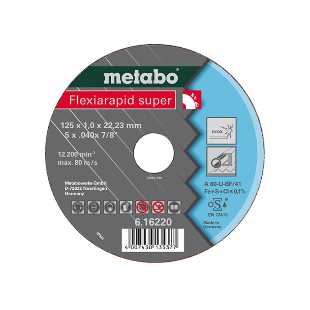 5 Flexiarapid Super 76x1,0x10,0 мм Inox, TF 41 (626870000) Metabo – это супер-тонкие, высокопроизводительные отрезные круги, специально разработанные для самых требовательных работ с металлом. Эти круги являются идеальным выбором для обработки всех разновидностей высокосортных, нержавеющих и кислотостойких сталей (V2A, Nirosta, INOX), а также пружинных и инструментальных сталей.
