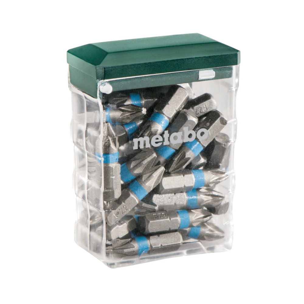 Ці насадки виготовлені з хромованадієвої сталі (якість S2), що забезпечує їм виняткову міцність, зносостійкість та тривалий термін служби. Кожна біта має умовне пофарбування, що значно спрощує її ідентифікацію та прискорює вибір потрібного інструменту під час роботи. Комплект постачається у міцному та зручному футлярі фірмового дизайну Metabo. Футляр має кріплення з отворами євростандарту, що дозволяє легко розмістити його на стійці або панелі інструментів.